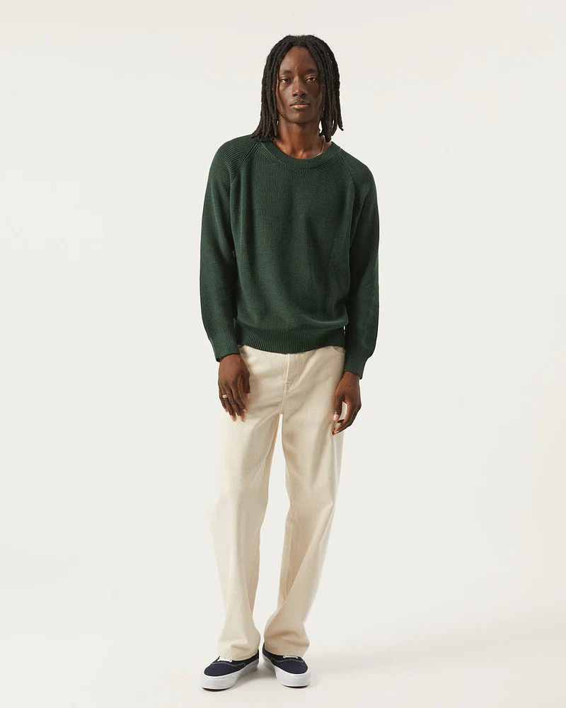 Our new crewneck sweater was also designed to honor vintage styles while enhancing the product. We opted for a cut-and-sew approach rather than using a tubular body for this garment, which is part of our strategy to give each piece as much life as possible. Tubular bodies will twist and shrink over time much more than sewn panels, with little benefit other than aesthetic. The flatlock side seams adds stability to the garment without taking away comfort. The flatseamer sewing process gives a soft, stretchy, comfortable seam with very little bulk but requires quite a bit of skill on the part of the machinist, especially when sewing the complicated lines of our modified raglan sleeve.